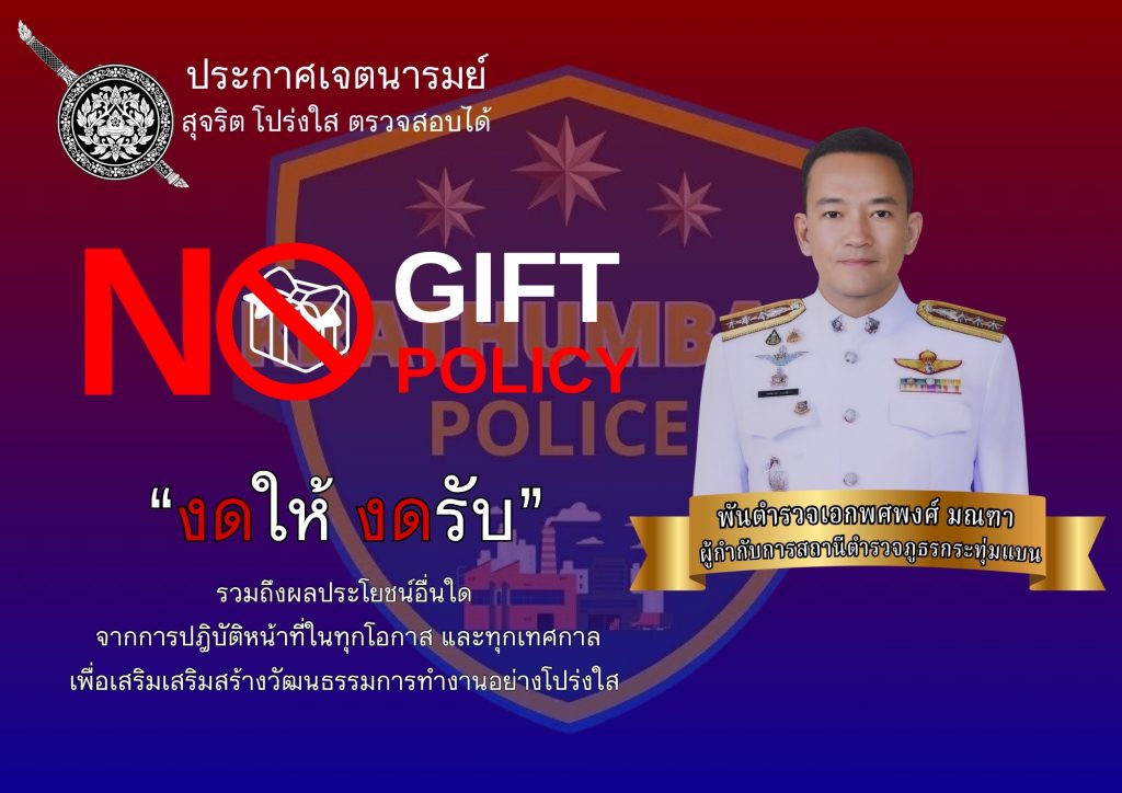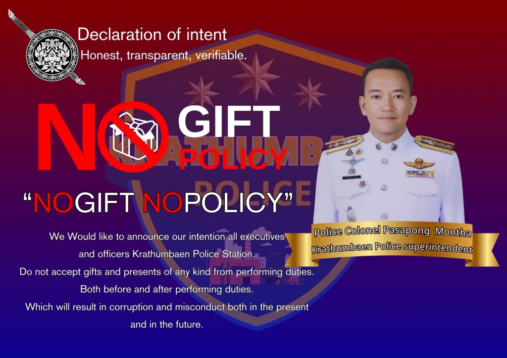 - ประกาศสำนักงานยุทธศาสตร์ตำรวจเรื่องเจตนารมณ์ที่จะไม่รับของขวัญหรือของกำนัลทุกชนิดจากการปฏิบัติหน้าที่